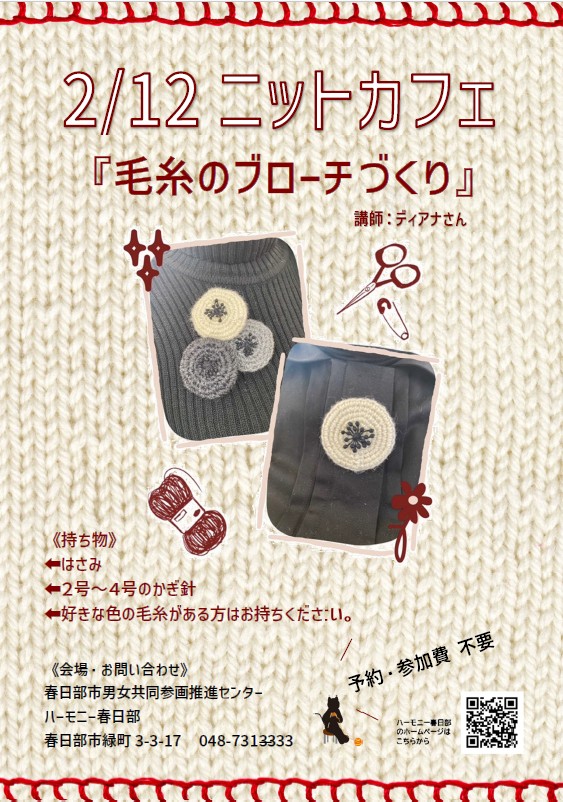 編み棒、編み針、毛糸をお持ちの方はご持参ください。(お持ちでない方は針・棒、毛糸をこちらでも用意しています。)