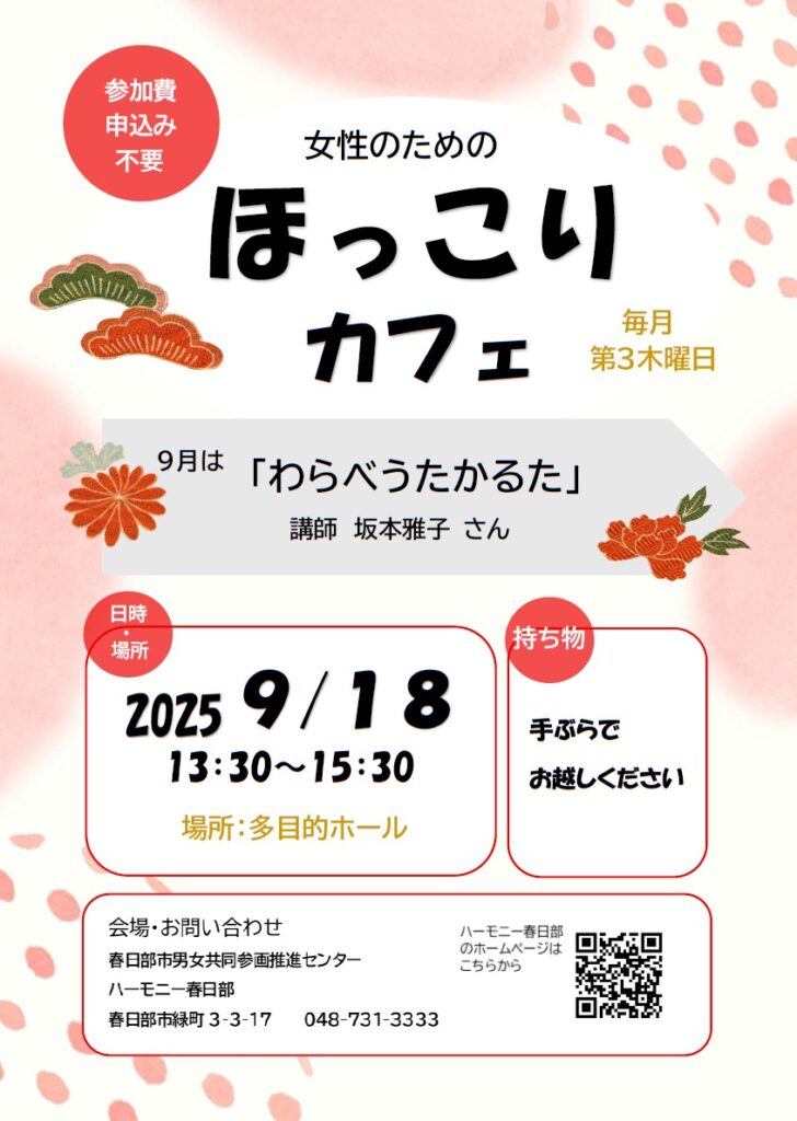 9月のほっこりカフェ開催のお知らせ 7月 26, 2025 最終更新日時 : 9月 28, 2025 machikatsu 9月のほっこりカフェは「わらべうたかるた」で楽しみませんか♪ 参加費、予約は不要です♪ お気軽にご参加ください♪ 日時 2025年9月18日(木) 13:30〜15:30 対象 女性 持ちもの なし 参加費 無料 お申し込み 不要