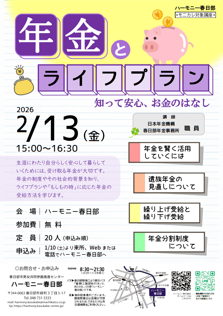 年金とライフプラン~知って安心、お金のはなし~ 12月 23, 2025 最終更新日時 : 12月 23, 2025 machikatsu 生涯にわたり自分らしく安心して暮らしていくためには、受け取る年金が大切です。年金の制度やその社会的背景を知り、ライフプランや「もしもの時」に応じた年金の受給方法を学びます。 日時 2026年2月13日(金)15:00~16:30 講師 日本年金機構春日部年金事務所 職員 定員 20名(申し込み順) お申込み/お問い合わせ 1月10日(土)より来所または電話(Tel.048-731-3333)でハーモニー春日部へまたは下記の申し込みフォームからも申込みいただけます。